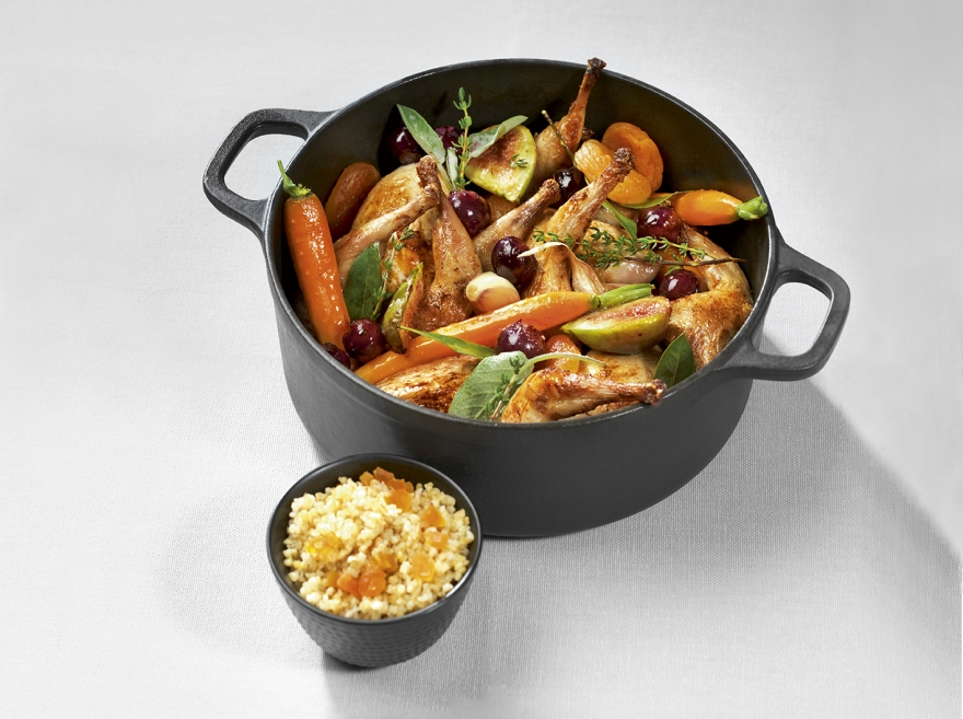 Faire colorer les cailles dans une cocotte puis ajouter la gousse d’ail, 4 abricots